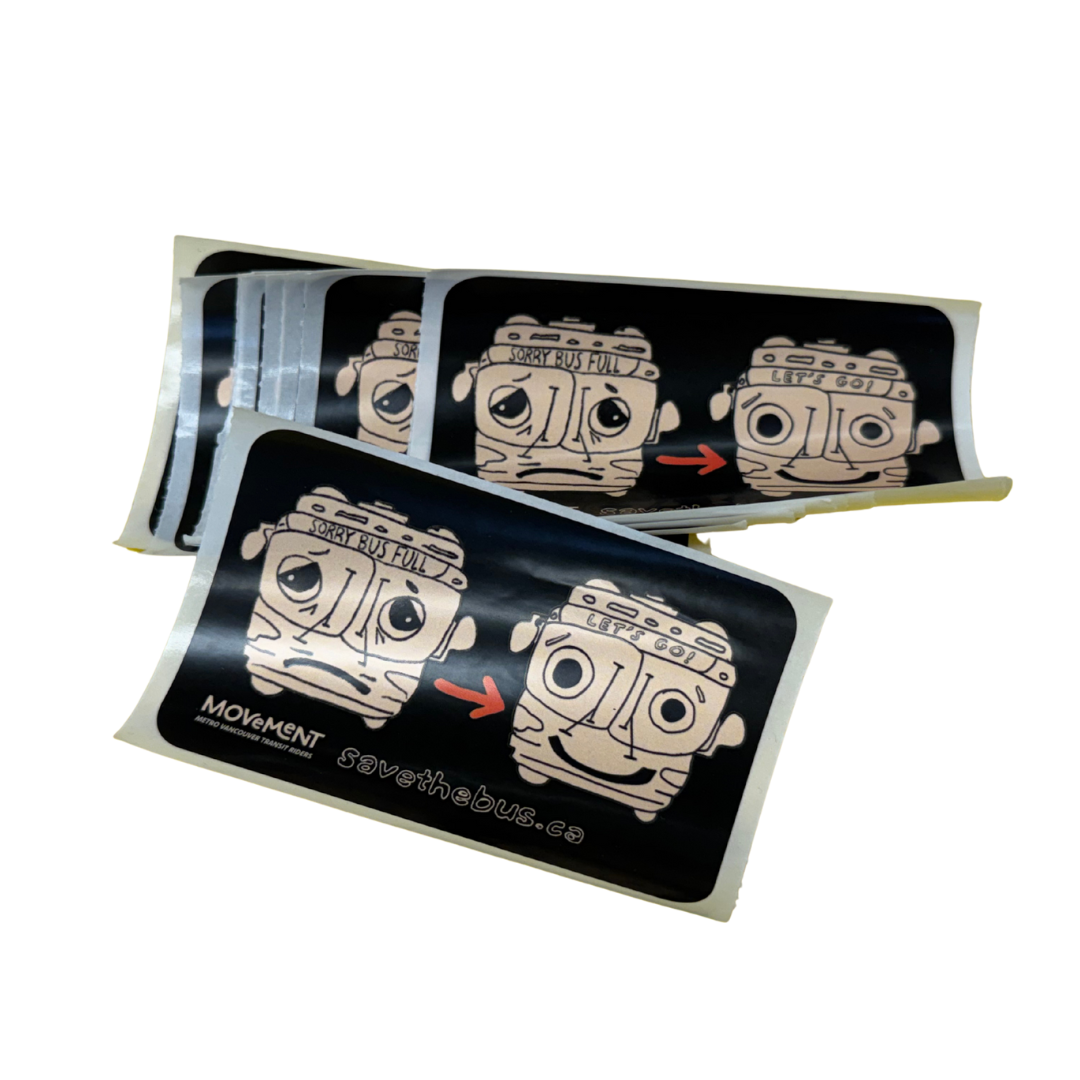 The “Save The Bus” days may be over, but your purchase of these iconic ‘sad bus’ and ‘happy bus’ stickers is not only a keepsake but a way of supporting the efforts Movement is putting into making transit better in Metro Vancouver. There is a quantity limit of one 10-pack per order.