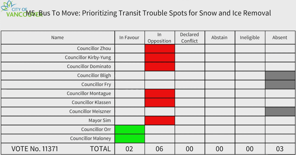 VANCOUVER – At the Vancouver Standing Committee on City Finance and Services Meeting on Wednesday, February 4th, the majority voted against a motion that would give snow clearing priority to transit trouble spots.